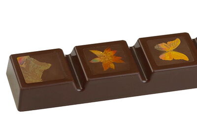 We have created a standard chocolate bar and pralines with that effect.